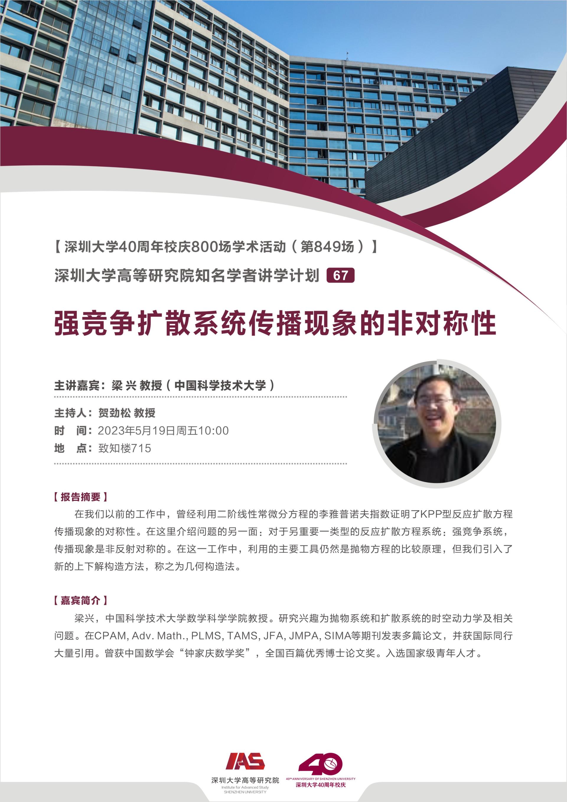 梁兴,中国科学技术大学数学科学学院教授。研究兴趣为抛物系统和扩散系统的时空动力学及相关问题。在CPAM, Adv. Math., PLMS, TAMS, JFA, JMPA, SIMA等期刊发表多篇论文,并获国际同行大量引用。曾获中国数学会“钟家庆数学奖”,全国百篇优秀博士论文奖。入选国家级青年人才。