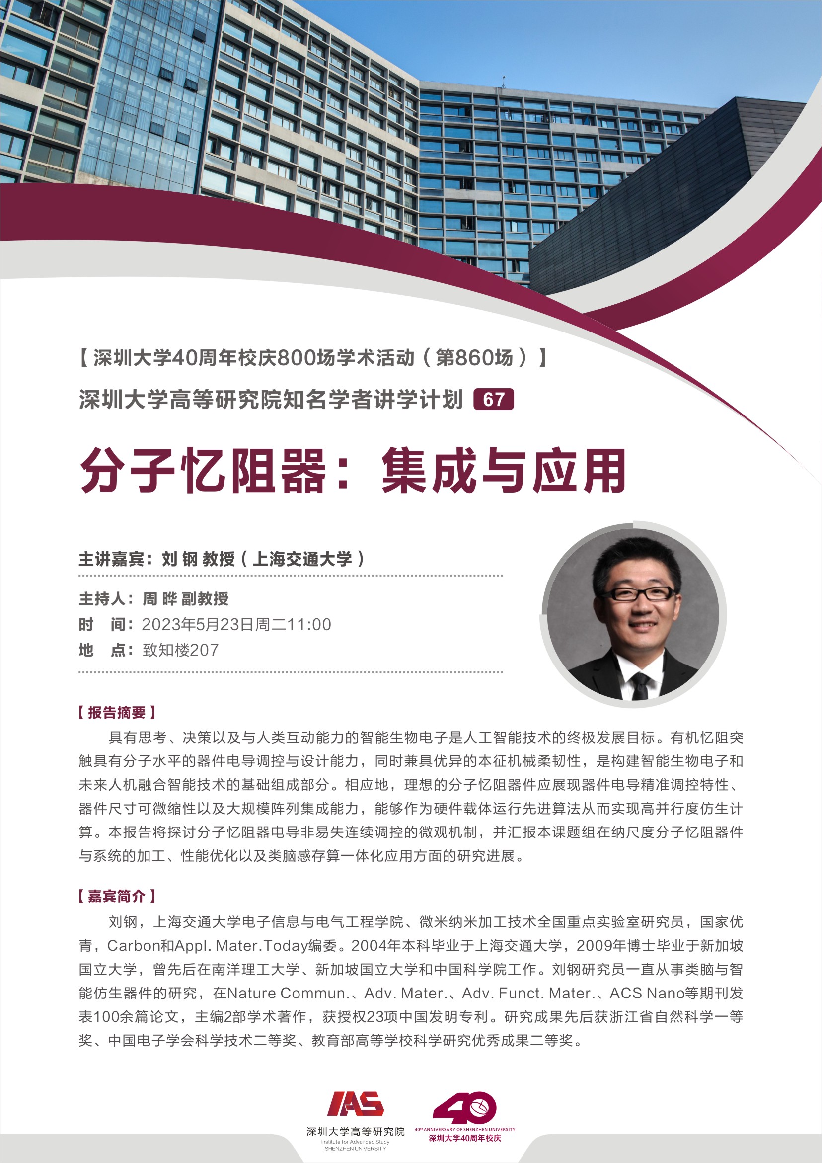 具有思考、决策以及与人类互动能力的智能生物电子是人工智能技术的终极发展目标。有机忆阻突触具有分子水平的器件电导调控与设计能力,同时兼具优异的本征机械柔韧性,是构建智能生物电子和未来人机融合智能技术的基础组成部分。相应地,理想的分子忆阻器件应展现器件电导精准调控特性、器件尺寸可微缩性以及大规模阵列集成能力,能够作为硬件载体运行先进算法从而实现高并行度仿生计算。本报告将探讨分子忆阻器电导非易失连续调控的微观机制,并汇报本课题组在纳尺度分子忆阻器件与系统的加工、性能优化以及类脑感存算一体化应用方面的研究进展。