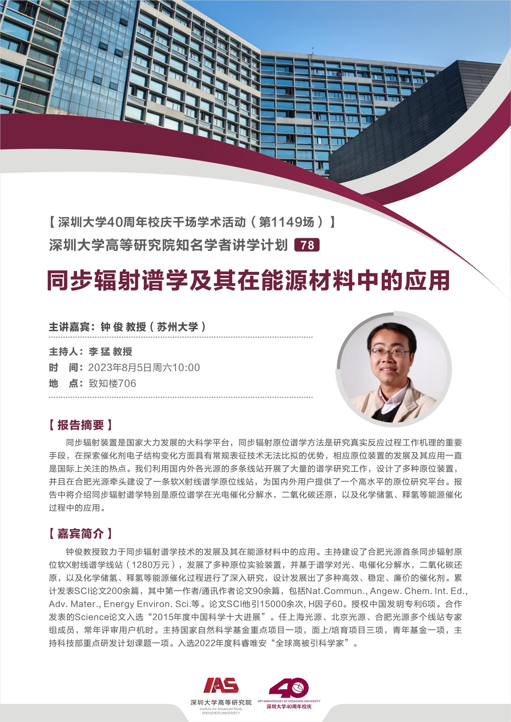 钟俊教授致力于同步辐射谱学技术的发展及其在能源材料中的应用。主持建设了合肥光源首条同步辐射原位软X射线谱学线站(1280万元),发展了多种原位实验装置,并基于谱学对光、电催化分解水,二氧化碳还原,以及化学储氢、释氢等能源催化过程进行了深入研究,设计发展出了多种高效、稳定、廉价的催化剂。累计发表SCI论文200余篇,其中第一作者/通讯作者论文90余篇,包括Nat.Commun., Angew. Chem. Int. Ed., Adv. Mater., Energy Environ. Sci.等。论文SCI他引15000余次, H因子60。授权中国发明专利6项。合作发表的Science论文入选“2015年度中国科学十大进展”。任上海光源、北京光源、合肥光源多个线站专家组成员,常年评审用户机时。主持国家自然科学基金重点项目一项,面上/培育项目三项,青年基金一项,主持科技部重点研发计划课题一项。入选2022年度科睿唯安“全球高被引科学家”。