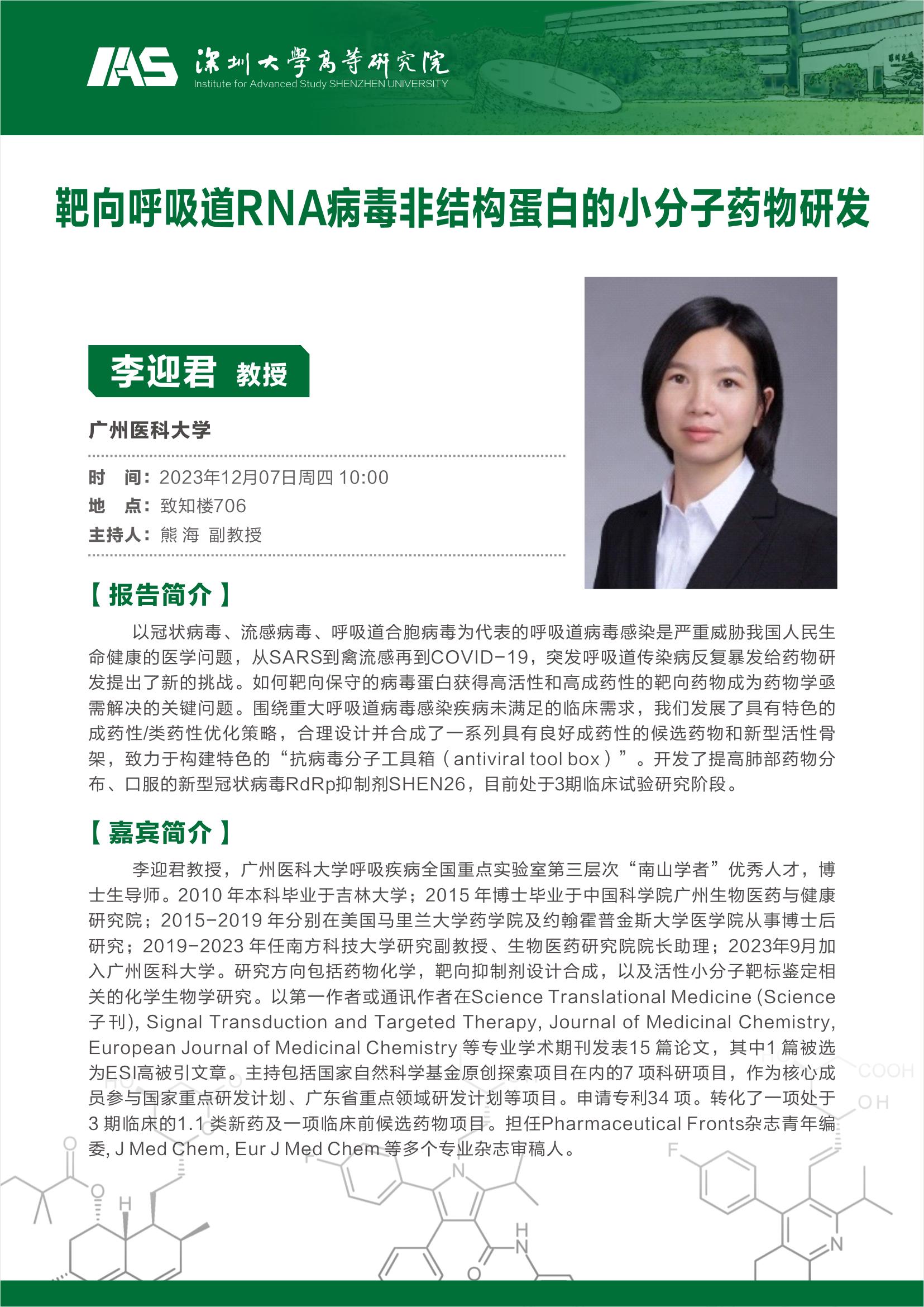 李迎君教授,广州医科大学呼吸疾病全国重点实验室第三层次“南山学者”优秀人才,博士生导师。2010年本科毕业于吉林大学;2015年博士毕业于中国科学院广州生物医药与健康研究院;2015-2019年分别在美国马里兰大学药学院及约翰霍普金斯大学医学院从事博士后研究;2019-2023年任南方科技大学研究副教授、生物医药研究院院长助理;2023年9月加入广州医科大学。研究方向包括药物化学,靶向抑制剂设计合成,以及活性小分子靶标鉴定相关的化学生物学研究。以第一作者或通讯作者在Science Translational Medicine (Science子刊), Signal Transduction and Targeted Therapy, Journal of Medicinal Chemistry, European Journal of Medicinal Chemistry等专业学术期刊发表15篇论文,其中1篇被选为ESI高被引文章。主持包括国家自然科学基金原创探索项目在内的7项科研项目,作为核心成员参与国家重点研发计划、广东省重点领域研发计划等项目。申请专利34项。转化了一项处于3期临床的1.1类新药及一项临床前候选药物项目。担任Pharmaceutical Fronts杂志青年编委, J Med Chem, Eur J Med Chem等多个专业杂志审稿人。