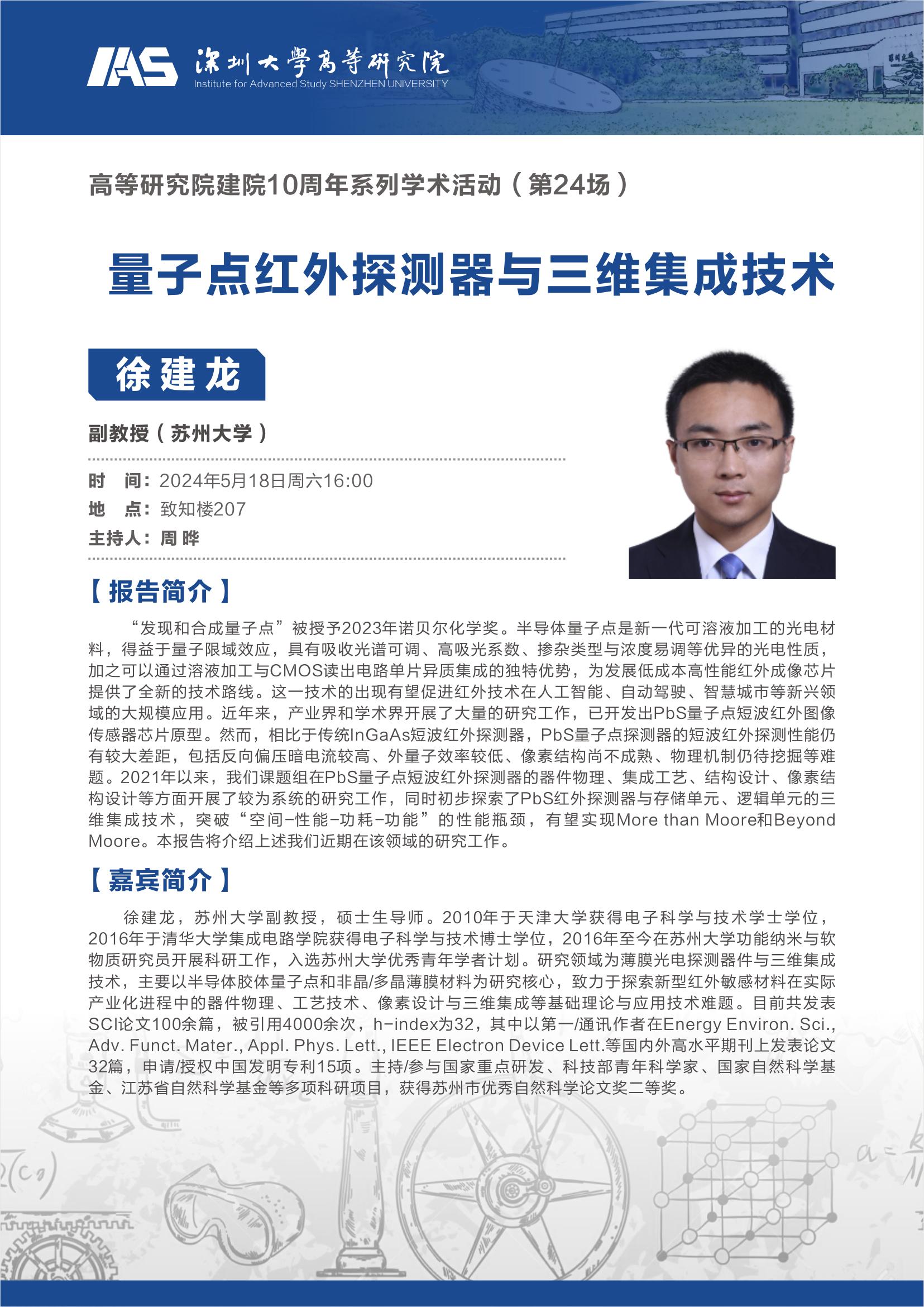 徐建龙,苏州大学副教授,硕士生导师。2010年于天津大学获得电子科学与技术学士学位,2016年于清华大学集成电路学院获得电子科学与技术博士学位,2016年至今在苏州大学功能纳米与软物质研究员开展科研工作,入选苏州大学优秀青年学者计划。研究领域为薄膜光电探测器件与三维集成技术,主要以半导体胶体量子点和非晶/多晶薄膜材料为研究核心,致力于探索新型红外敏感材料在实际产业化进程中的器件物理、工艺技术、像素设计与三维集成等基础理论与应用技术难题。目前共发表SCI论文100余篇,被引用4000余次,h-index为32,其中以第一/通讯作者在Energy Environ. Sci., Adv. Funct. Mater., Appl. Phys. Lett., IEEE Electron Device Lett.等国内外高水平期刊上发表论文32篇,申请/授权中国发明专利15项。主持/参与国家重点研发、科技部青年科学家、国家自然科学基金、江苏省自然科学基金等多项科研项目,获得苏州市优秀自然科学论文奖二等奖。