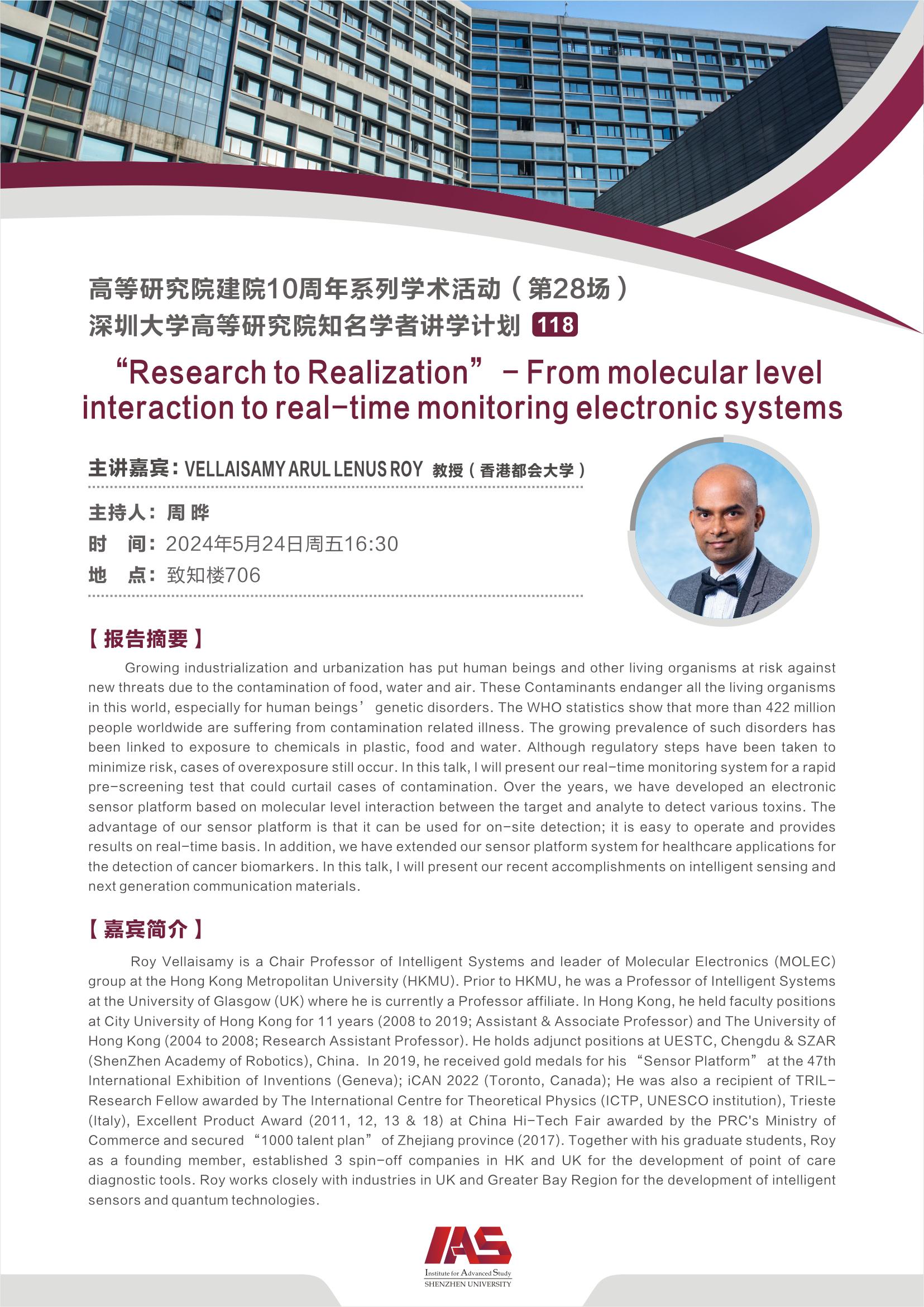 报告主题:“Research to Realization” - From molecular level interaction to real-time monitoring electronic systems