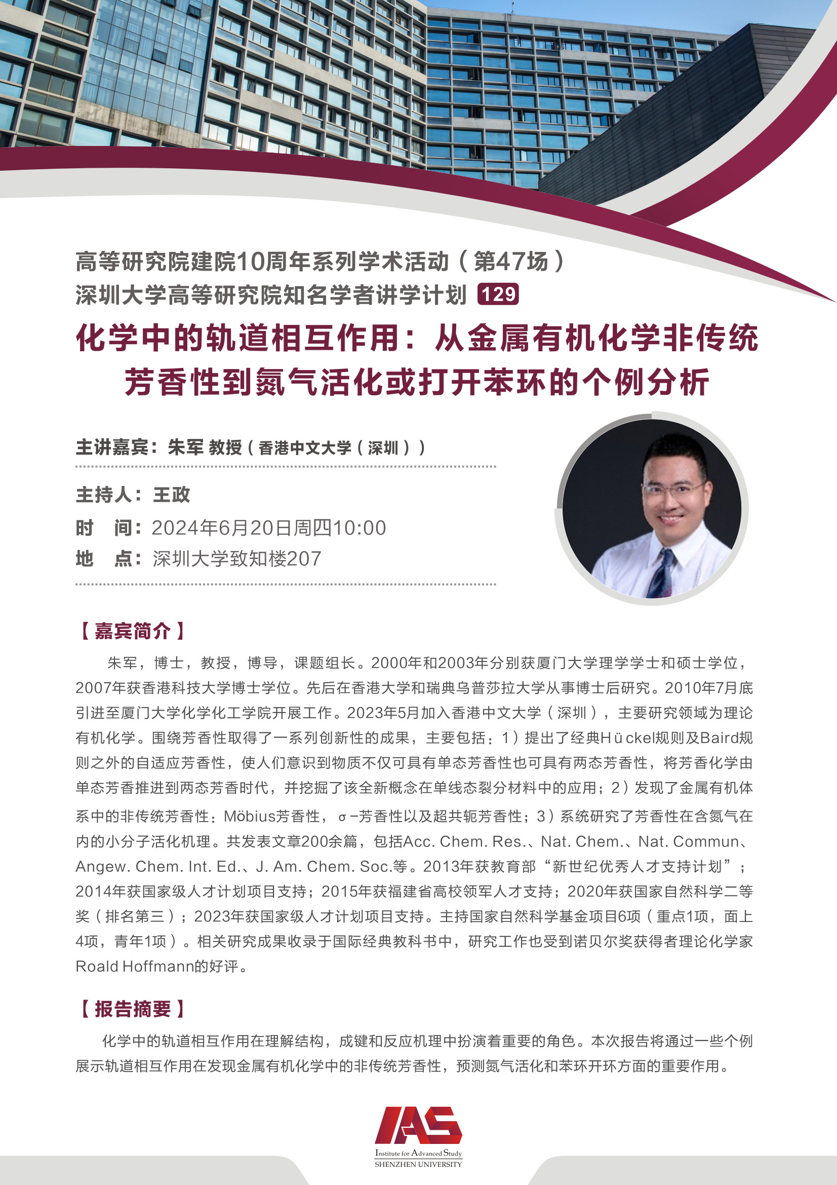 朱军,博士,教授,博导,课题组长。2000年和2003年分别获厦门大学理学学士和硕士学位,2007年获香港科技大学博士学位。先后在香港大学和瑞典乌普莎拉大学从事博士后研究。2010年7月底引进至厦门大学化学化工学院开展工作。2023年5月加入香港中文大学(深圳),主要研究领域为理论有机化学。围绕芳香性取得了一系列创新性的成果,主要包括:1)提出了经典Hückel规则及Baird规则之外的自适应芳香性,使人们意识到物质不仅可具有单态芳香性也可具有两态芳香性,将芳香化学由单态芳香推进到两态芳香时代,并挖掘了该全新概念在单线态裂分材料中的应用;2)发现了金属有机体系中的非传统芳香性:Möbius芳香性,σ-芳香性以及超共轭芳香性;3)系统研究了芳香性在含氮气在内的小分子活化机理。共发表文章200余篇,包括Acc. Chem. Res.、Nat. Chem.、Nat. Commun、Angew. Chem. Int. Ed.、J. Am. Chem. Soc.等。2013年获教育部“新世纪优秀人才支持计划”;2014年获国家级人才计划项目支持;2015年获福建省高校领军人才支持;2020年获国家自然科学二等奖(排名第三);2023年获国家级人才计划项目支持。主持国家自然科学基金项目6项(重点1项,面上4项,青年1项)。相关研究成果收录于国际经典教科书中,研究工作也受到诺贝尔奖获得者理论化学家Roald Hoffmann的好评。