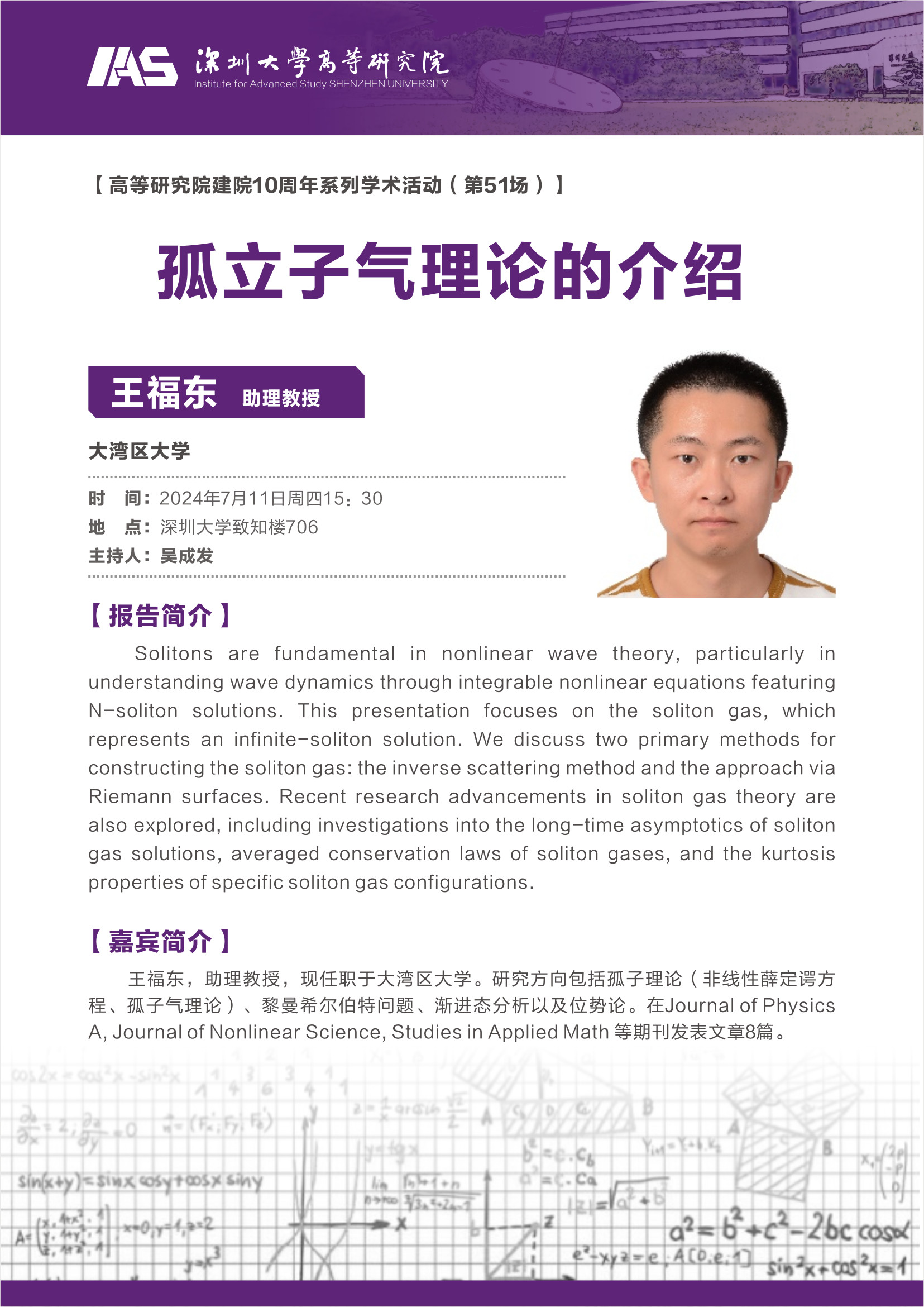 王福东,助理教授,现任职于大湾区大学。研究方向包括孤子理论(非线性薛定谔方程、孤子气理论)、矩阵李曼希尔伯特问题、渐进态分析以及位势论。在Journal of Physics A, Journal of Nonlinear Science, Studies in Applied Math等期刊发表文章8篇。