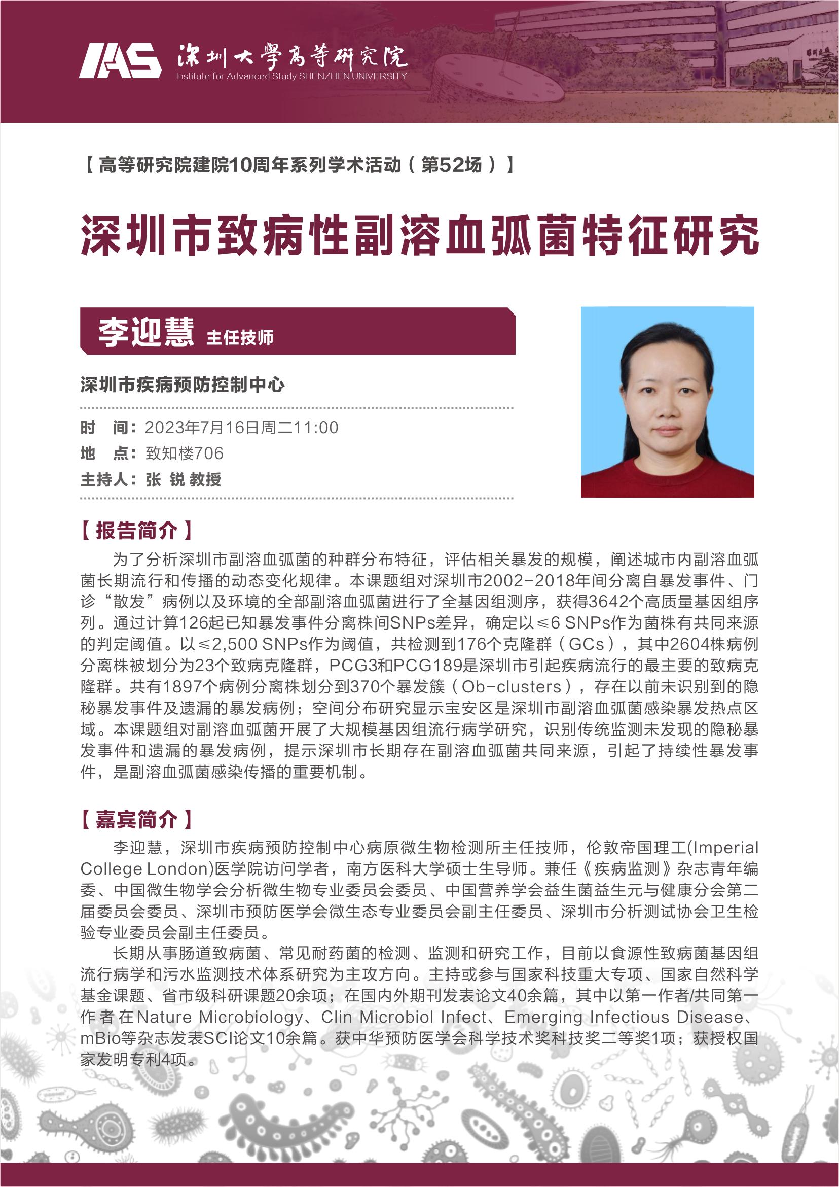 李迎慧,深圳市疾病预防控制中心病原微生物检测所主任技师,伦敦帝国理工(Imperial College London)医学院访问学者,南方医科大学硕士生导师。兼任《疾病监测》杂志青年编委、中国微生物学会分析微生物专业委员会委员、中国营养学会益生菌益生元与健康分会第二届委员会委员、深圳市预防医学会微生态专业委员会副主任委员、深圳市分析测试协会卫生检验专业委员会副主任委员。