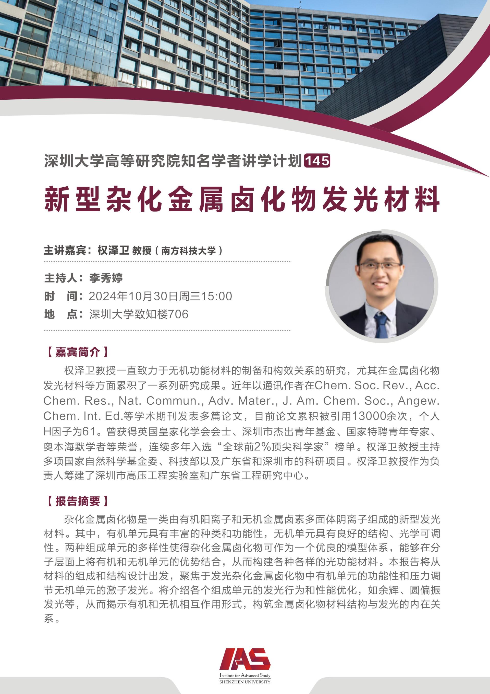 权泽卫教授一直致力于无机功能材料的制备和构效关系的研究,尤其在金属卤化物发光材料等方面累积了一系列研究成果。近年以通讯作者在Chem. Soc. Rev., Acc. Chem. Res., Nat. Commun., Adv. Mater., J. Am. Chem. Soc., Angew. Chem. Int. Ed.等学术期刊发表多篇论文,目前论文累积被引用13000余次,个人H因子为61。曾获得英国皇家化学会会士、深圳市杰出青年基金、国家级重大人才工程项目(青年)、奥本海默学者等荣誉,连续多年入选“全球前2%顶尖科学家”榜单。权泽卫教授主持多项国家自然科学基金委、科技部以及广东省和深圳市的科研项目。权泽卫教授作为负责人筹建了深圳市高压工程实验室和广东省工程研究中心。