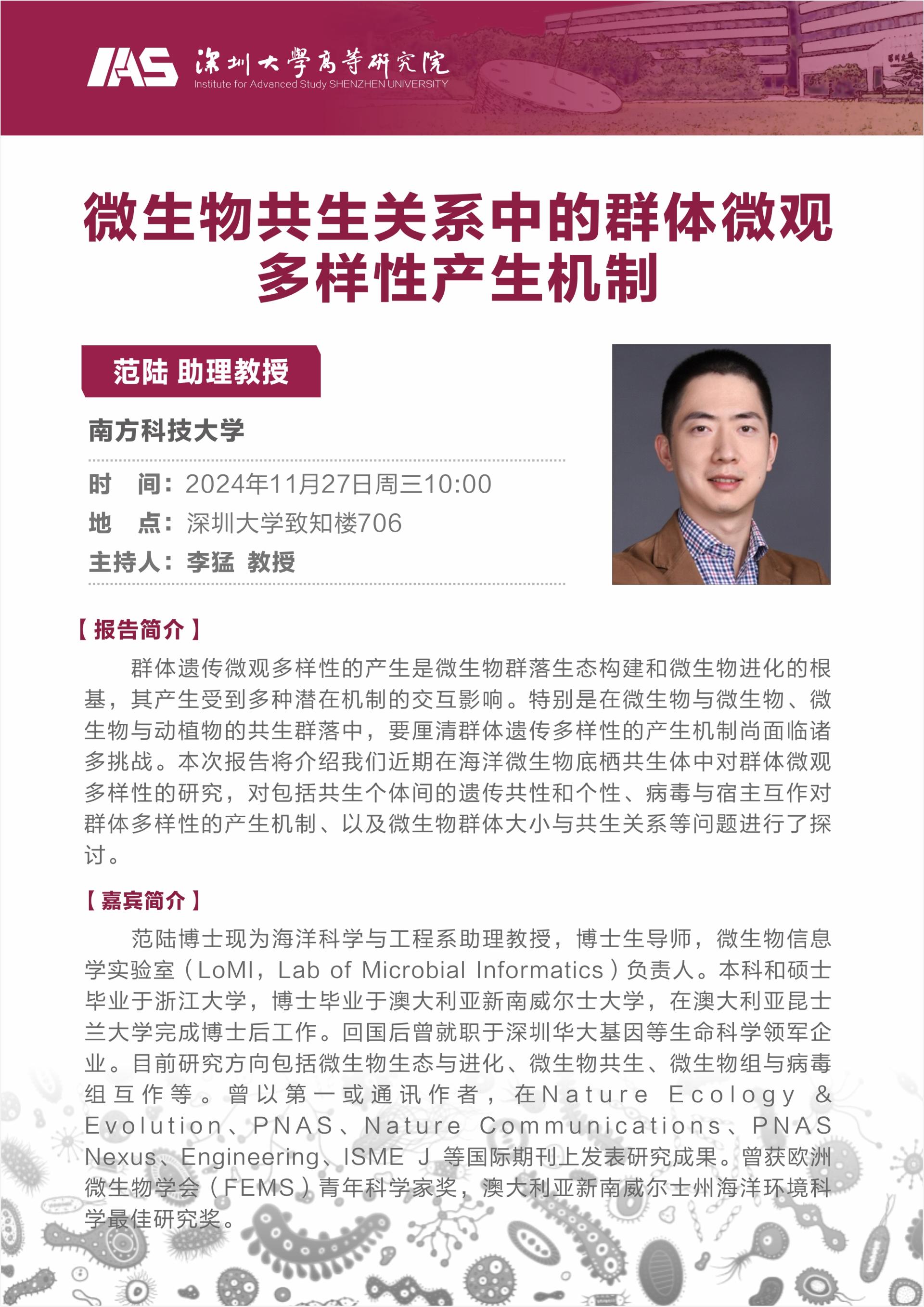 群体遗传微观多样性的产生是微生物群落生态构建和微生物进化的根基,其产生受到多种潜在机制的交互影响。特别是在微生物与微生物、微生物与动植物的共生群落中,要厘清群体遗传多样性的产生机制尚面临诸多挑战。本次报告将介绍我们近期在海洋微生物底栖共生体中对群体微观多样性的研究,对包括共生个体间的遗传共性和个性、病毒与宿主互作对群体多样性的产生机制、以及微生物群体大小与共生关系等问题进行了探讨。
