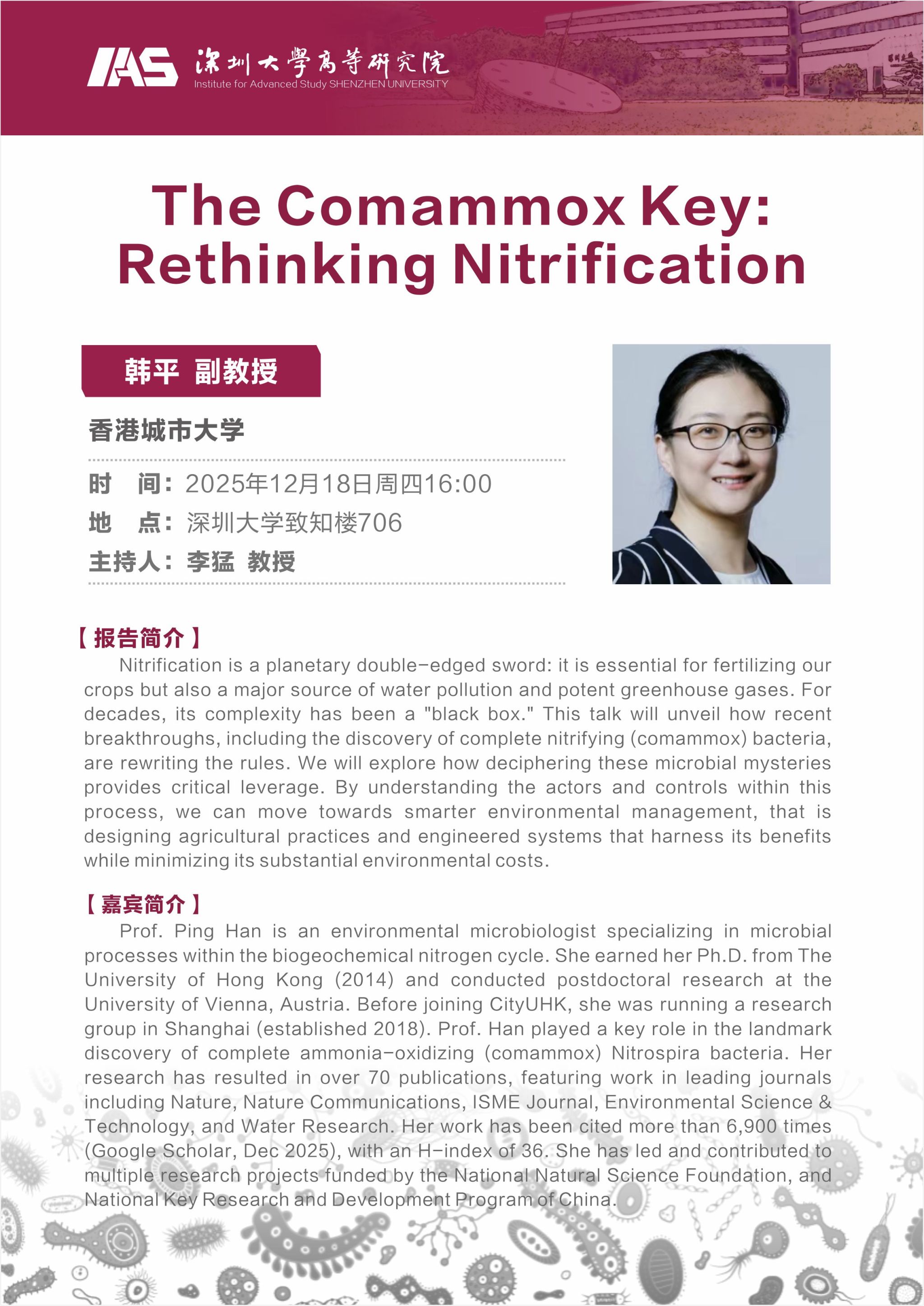 Prof. Ping Han is an environmental microbiologist specializing in microbial processes within the biogeochemical nitrogen cycle. She earned her Ph.D. from The University of Hong Kong (2014) and conducted postdoctoral research at the University of Vienna, Austria. Before joining CityUHK, she was running a research group in Shanghai (established 2018). Prof. Han played a key role in the landmark discovery of complete ammonia-oxidizing (comammox) Nitrospira bacteria. Her research has resulted in over 70 publications, featuring work in leading journals including Nature, Nature Communications, ISME Journal, Environmental Science & Technology, and Water Research. Her work has been cited more than 6,900 times (Google Scholar, Dec 2025), with an H-index of 36. She has led and contributed to multiple research projects funded by the National Natural Science Foundation, and National Key Research and Development Program of China.