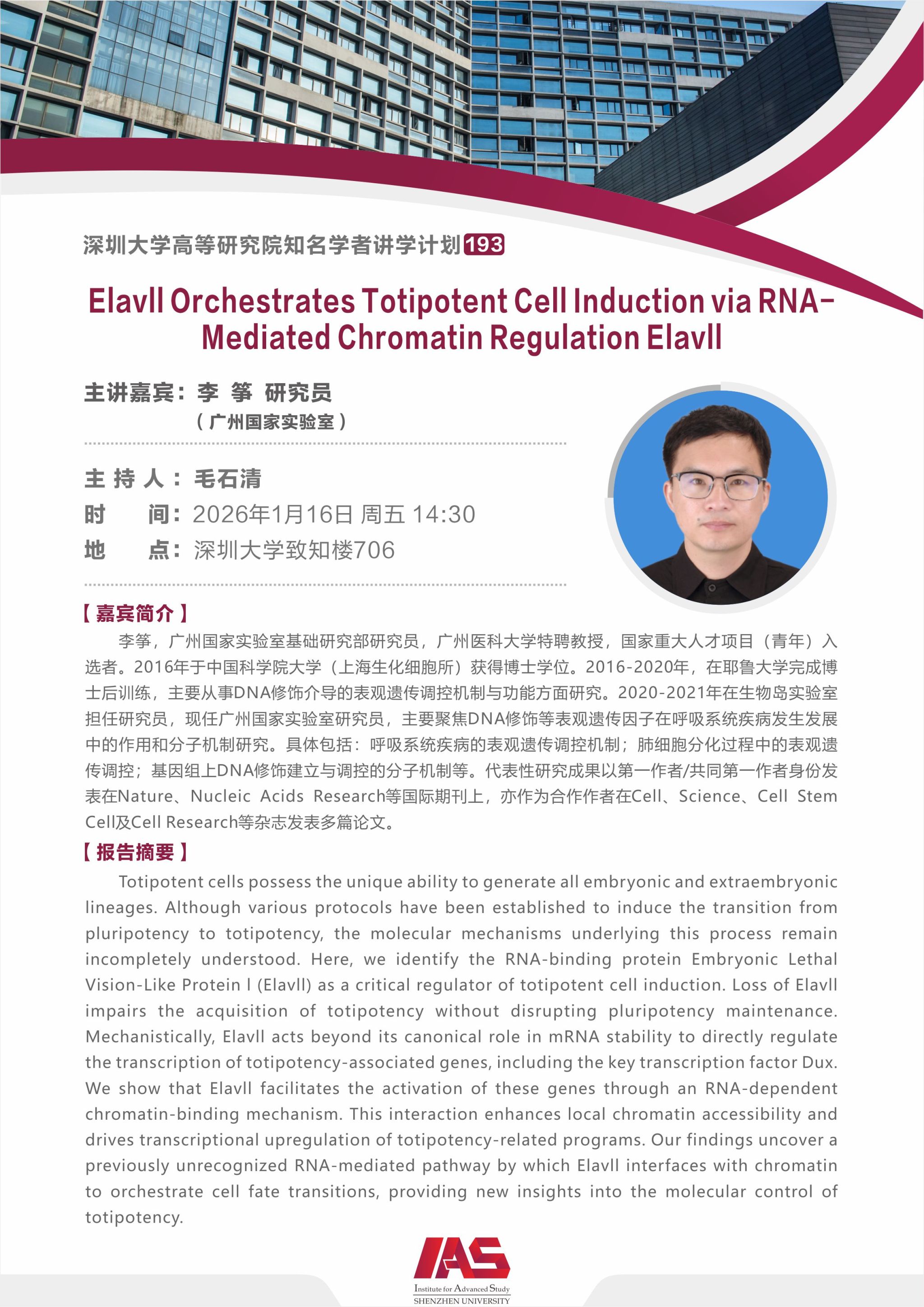 报告主题:Elavll Orchestrates Totipotent Cell Induction via RNA-Mediated Chromatin Regulation Elavll