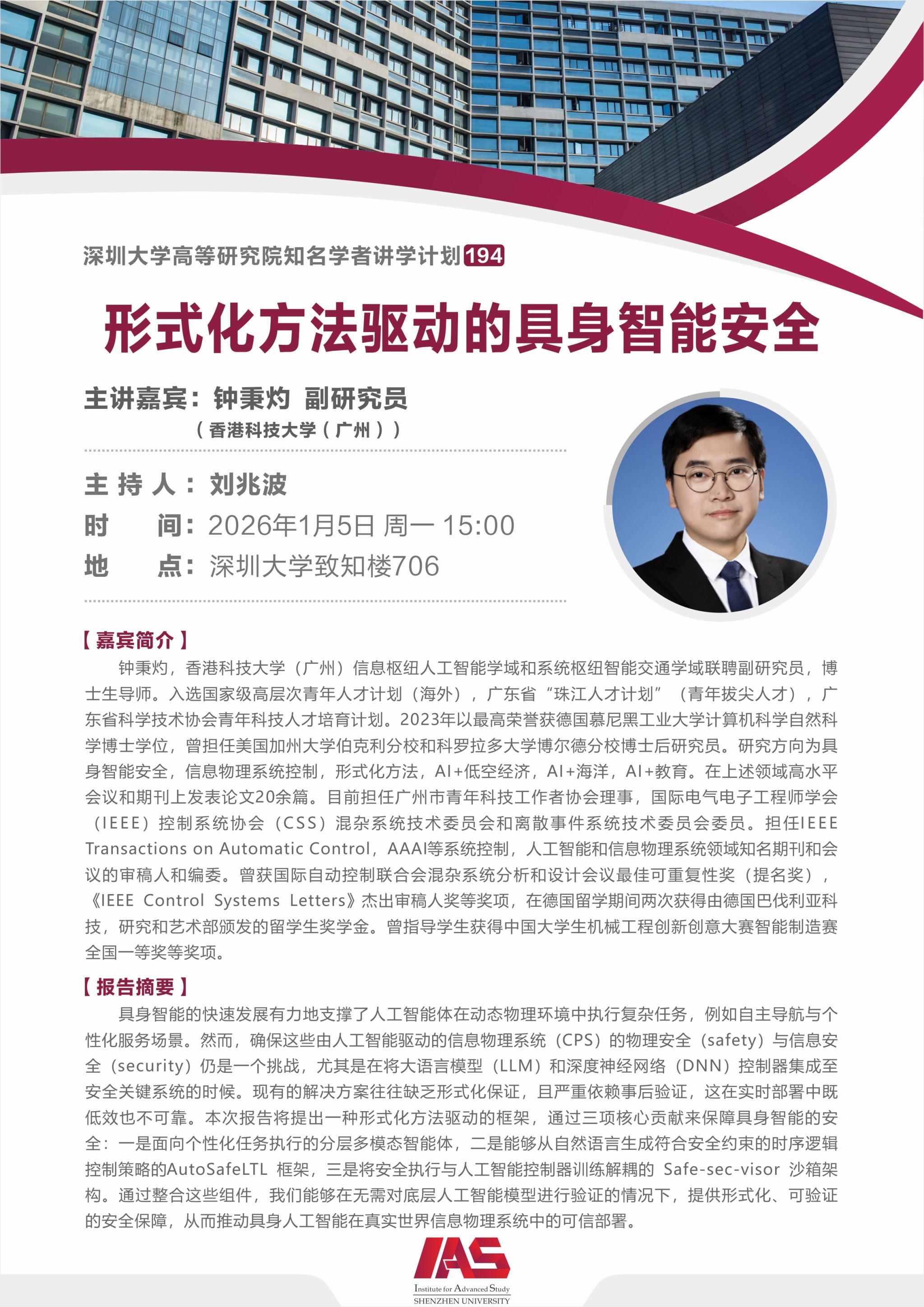 钟秉灼,香港科技大学(广州)信息枢纽人工智能学域和系统枢纽智能交通学域联聘副研究员,博士生导师。入选国家级高层次青年人才计划(海外),广东省“珠江人才计划”(青年拔尖人才),广东省科学技术协会青年科技人才培育计划。2023年以最高荣誉获德国慕尼黑工业大学计算机科学自然科学博士学位,曾担任美国加州大学伯克利分校和科罗拉多大学博尔德分校博士后研究员。研究方向为具身智能安全,信息物理系统控制,形式化方法,AI+低空经济,AI+海洋,AI+教育。在上述领域高水平会议和期刊上发表论文20余篇。目前担任广州市青年科技工作者协会理事,国际电气电子工程师学会(IEEE)控制系统协会(CSS)混杂系统技术委员会和离散事件系统技术委员会委员。担任IEEE Transactions on Automatic Control,AAAI等系统控制,人工智能和信息物理系统领域知名期刊和会议的审稿人和编委。曾获国际自动控制联合会混杂系统分析和设计会议最佳可重复性奖(提名奖),《IEEE Control Systems Letters》杰出审稿人奖等奖项,在德国留学期间两次获得由德国巴伐利亚科技,研究和艺术部颁发的留学生奖学金。曾指导学生获得中国大学生机械工程创新创意大赛智能制造赛全国一等奖等奖项。
