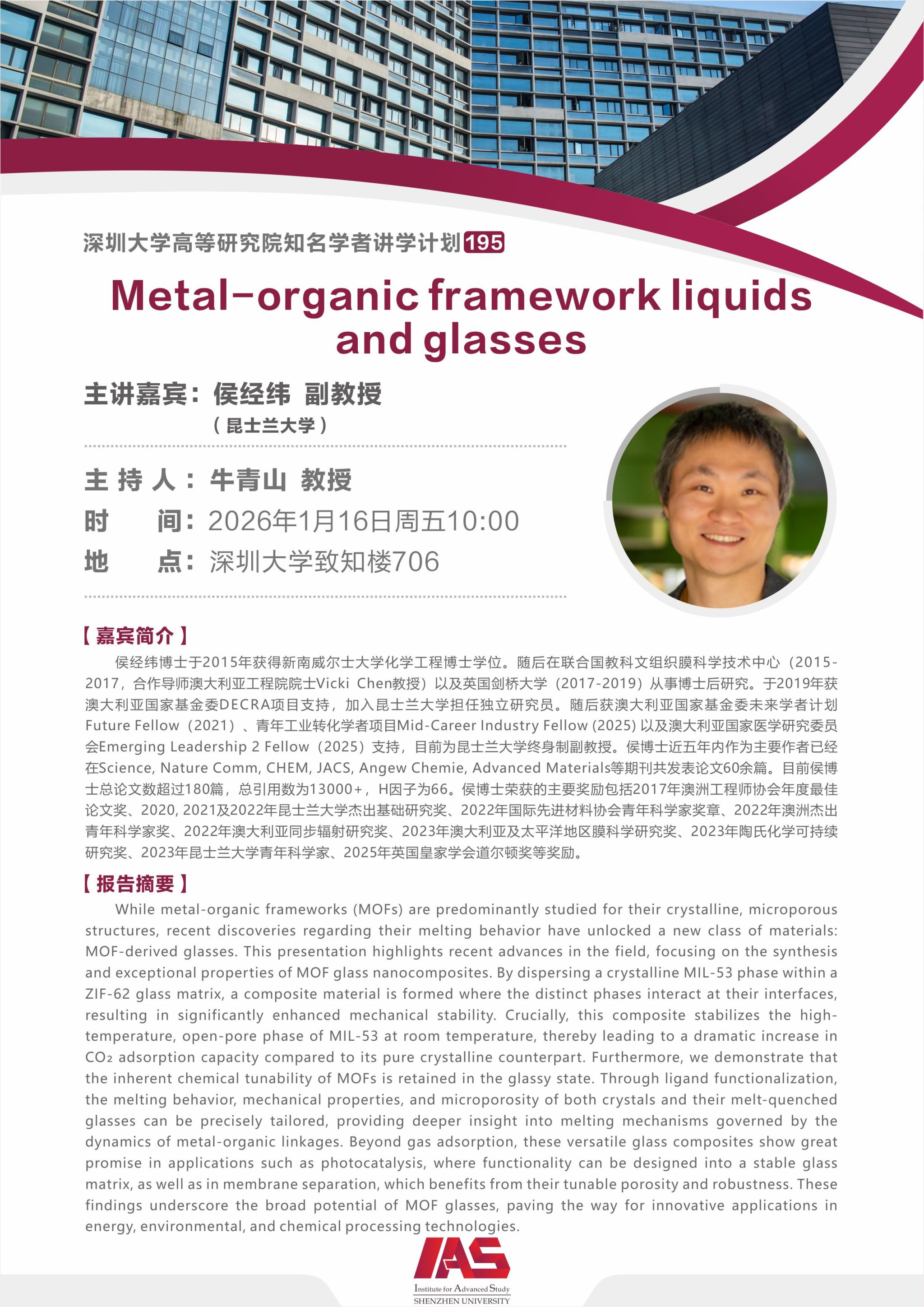侯经纬博士于2015年获得新南威尔士大学化学工程博士学位。随后在联合国教科文组织膜科学技术中心(2015-2017,合作导师澳大利亚工程院院士Vicki Chen教授)以及英国剑桥大学(2017-2019)从事博士后研究。于2019年获澳大利亚国家基金委DECRA项目支持,加入昆士兰大学担任独立研究员。随后获澳大利亚国家基金委未来学者计划Future Fellow(2021)、青年工业转化学者项目Mid-Career Industry Fellow (2025) 以及澳大利亚国家医学研究委员会Emerging Leadership 2 Fellow(2025)支持,目前为昆士兰大学终身制副教授。侯博士近五年内作为主要作者已经在Science, Nature Comm, CHEM, JACS, Angew Chemie, Advanced Materials等期刊共发表论文60余篇。目前侯博士总论文数超过180篇,总引用数为13000+,H因子为66。侯博士荣获的主要奖励包括2017年澳洲工程师协会年度最佳论文奖、2020, 2021及2022年昆士兰大学杰出基础研究奖、2022年国际先进材料协会青年科学家奖章、2022年澳洲杰出青年科学家奖、2022年澳大利亚同步辐射研究奖、2023年澳大利亚及太平洋地区膜科学研究奖、2023年陶氏化学可持续研究奖、2023年昆士兰大学青年科学家、2025年英国皇家学会道尔顿奖等奖励。