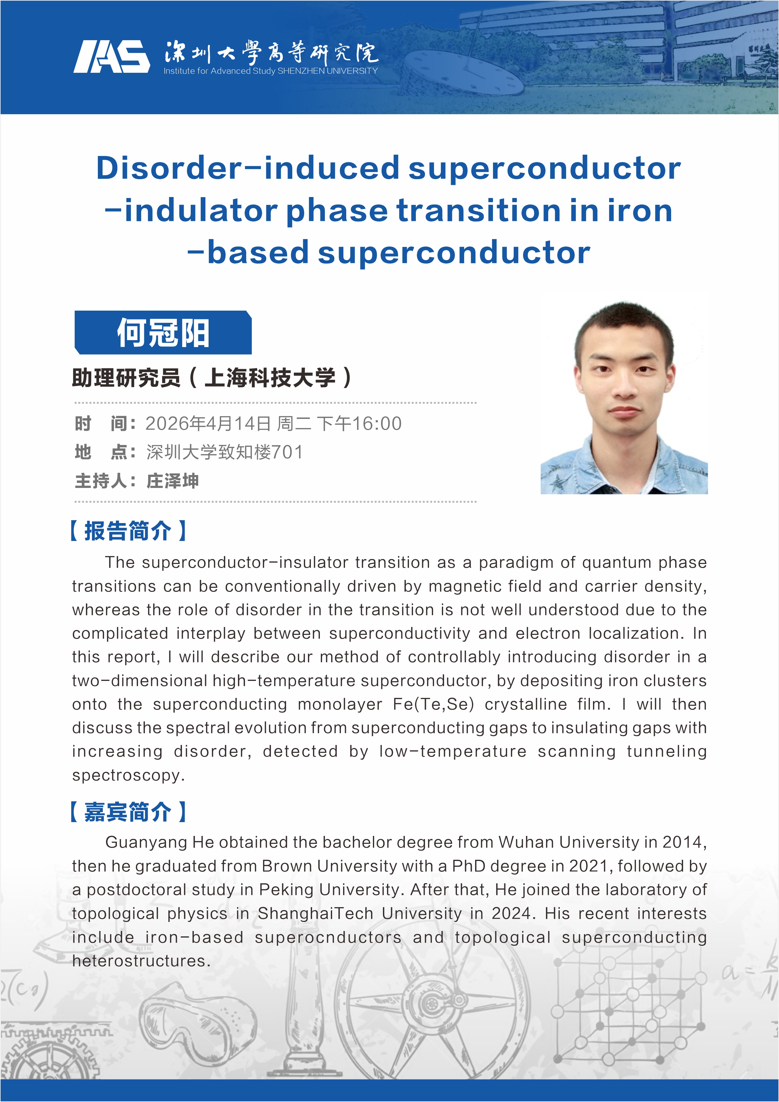 报告主题:Disorder-induced superconductor-indulator phase transition in iron-based superconductor
