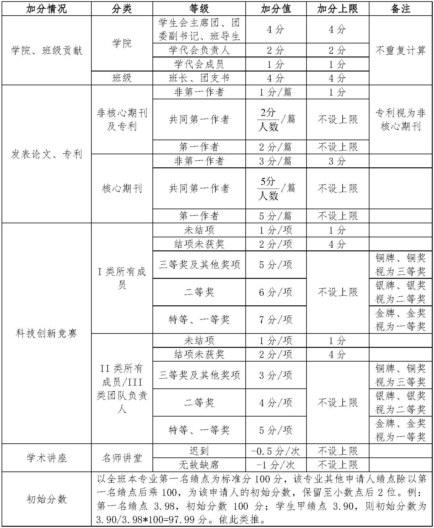 由学生自愿报名,学院根据2016级学生入学以来三个学期绩点排名计基础分(保留到小数点后两位),以全班学生中gpa最高者的绩点a为基础,计100分;其他同学的初始分数为gpa/a*100。例:甲同学的绩点3.8,则初始分数计为“3.8/a*100”分。在此分数基础上,学院根据申请人的学院及班级贡献、学术创新项目、考勤记录等情况加减分,得到每名申请者的综合得分。学院将所有申请同学的综合得分统一排序,若出现综合得分相同者,绩点高者优先。