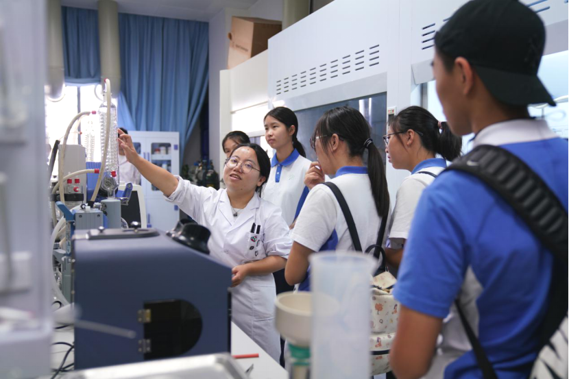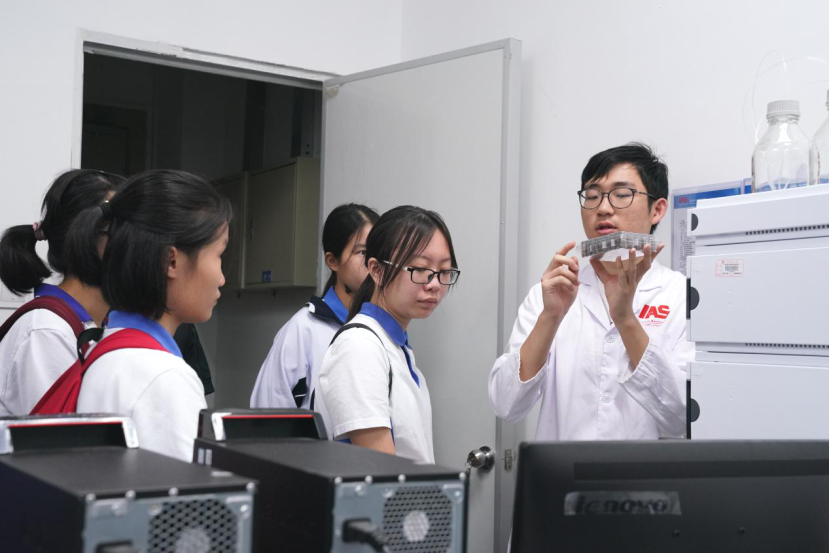 同学们怀着浓厚的兴趣走进了高等研究院实验室,参观了解了实验室仪器设备的运转和性能。在认真聆听赵烜同学的介绍和讲解后,同学们积极踊跃地提出心中的疑问,赵烜同学给予了耐心解答,并在他所在的实验室进行了规范性实验演示,也让同学们做了简单的实验尝试。