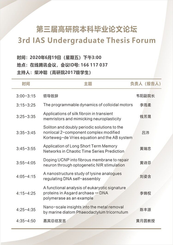 高等研究院2020届本科毕业论文答辩已圆满结束,在学院两年的科学研究训练和导师的专业指导下,学生们均圆满完成了毕业论文。