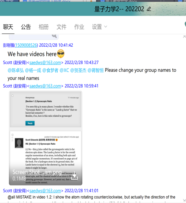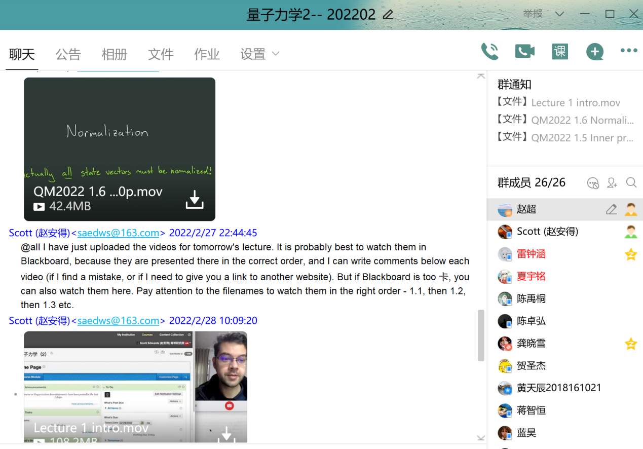 线上授课模式下SCOTT老师会在课前上传课件、自已录制视频,让同学们进行提前预习;课上同时保持BLACKBOARD+QQ群解答问题等方式进行,避免出现系统不畅通和网络不稳定的问题;在课后时间SCOTT老师也随时在QQ群组认真对同学提出的问题进行解疑。