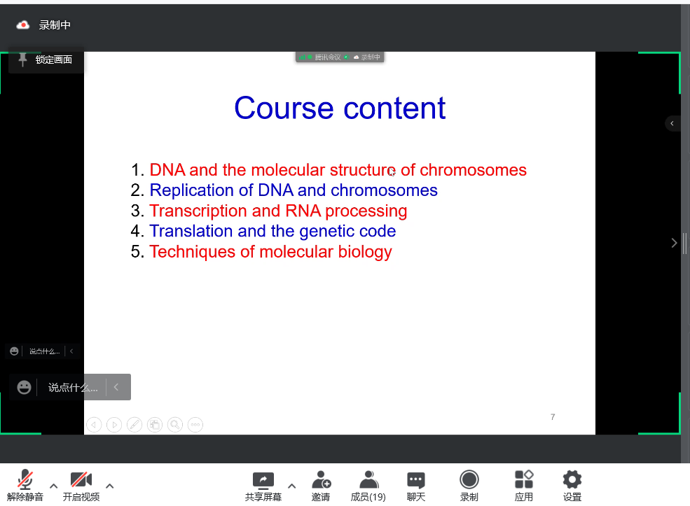 课前集体进行腾讯会议网络调试,课上曾老师对个人、教学内容、教学目标、考核方式等都进行了详细介绍,并不时地提出问题,曾老师特别强调,网课上没有明白的知识点,可以与老师实时互动,及时跟上课进度节奏掌握课堂内容。课后要主动进行复习,该门课作业及答案会在超星学习通平台上发布。