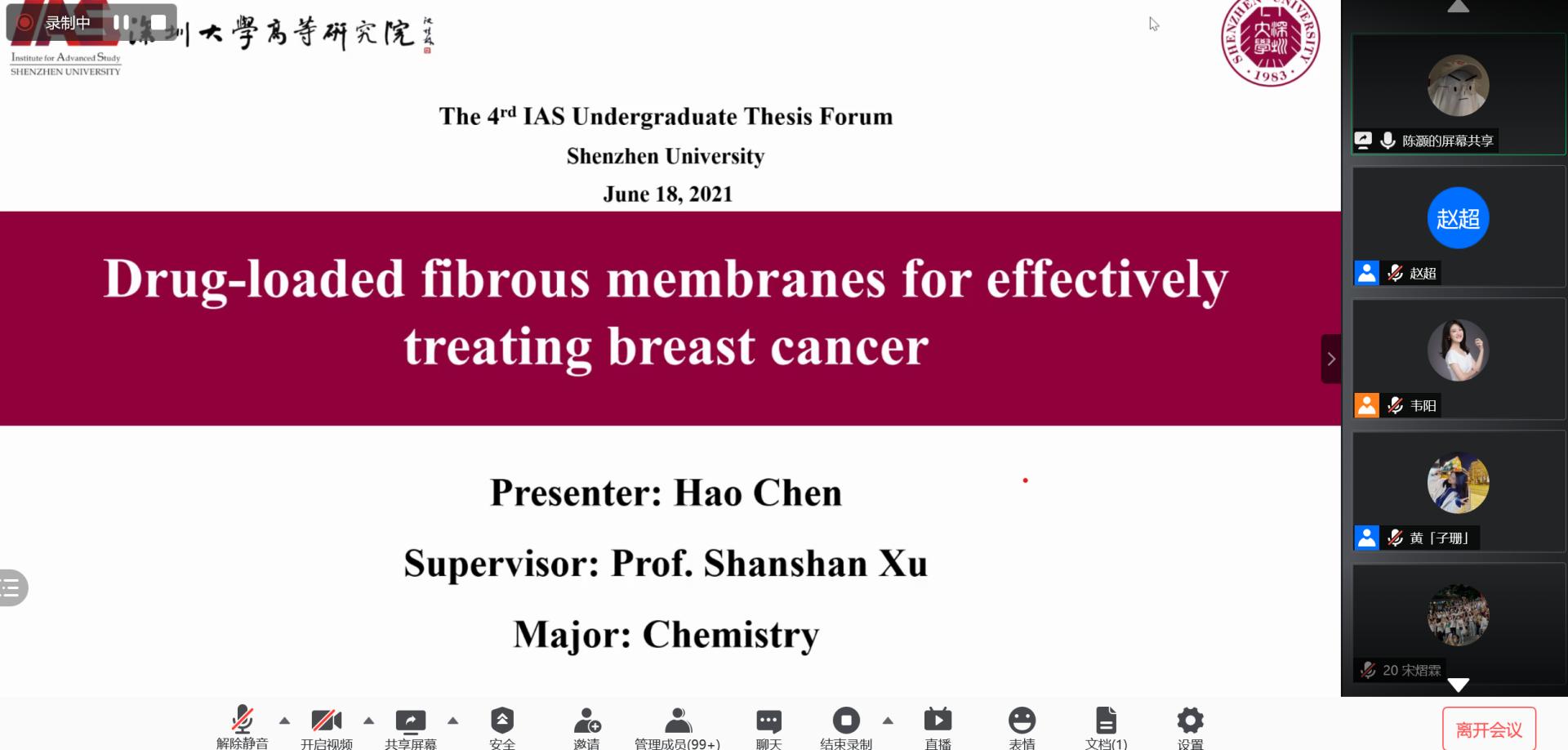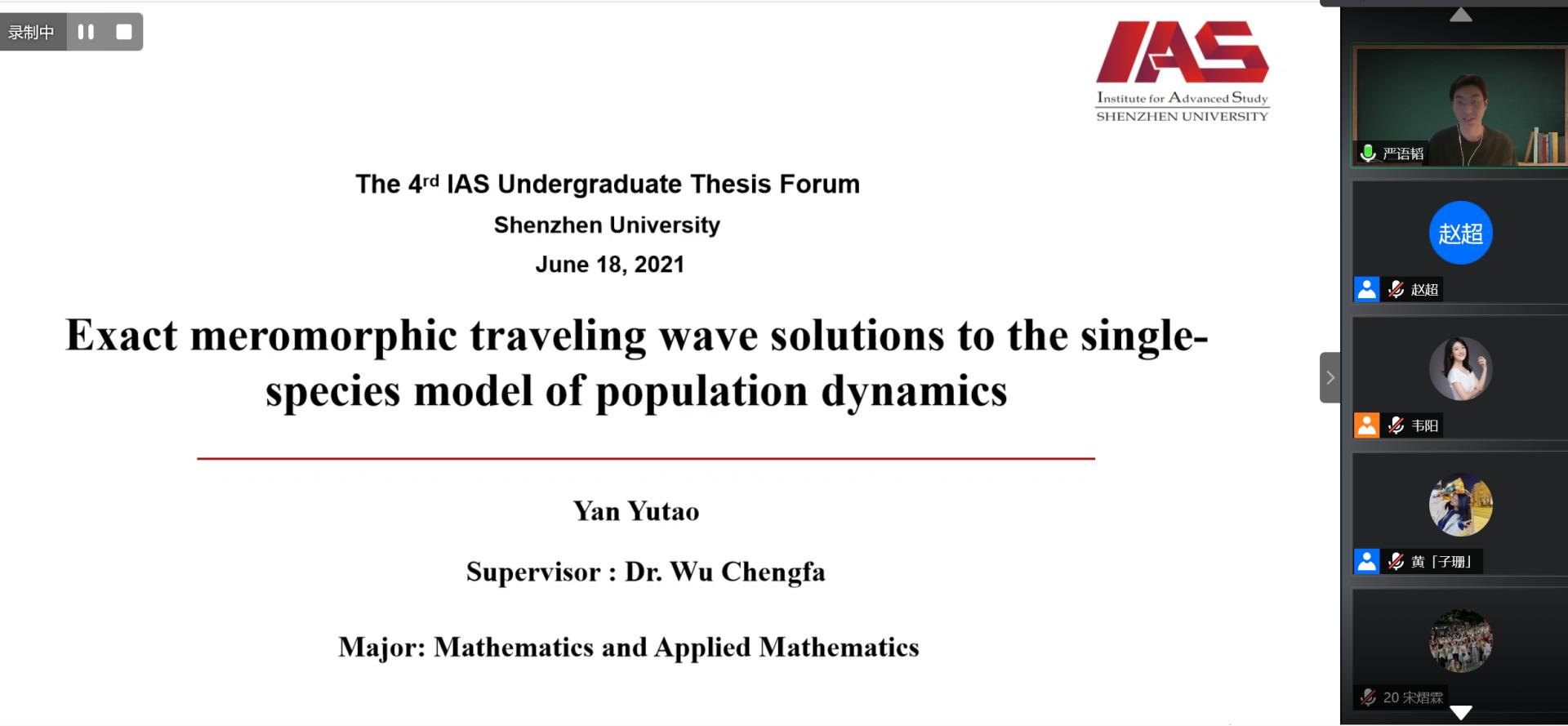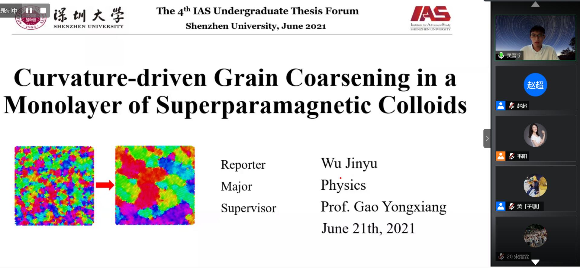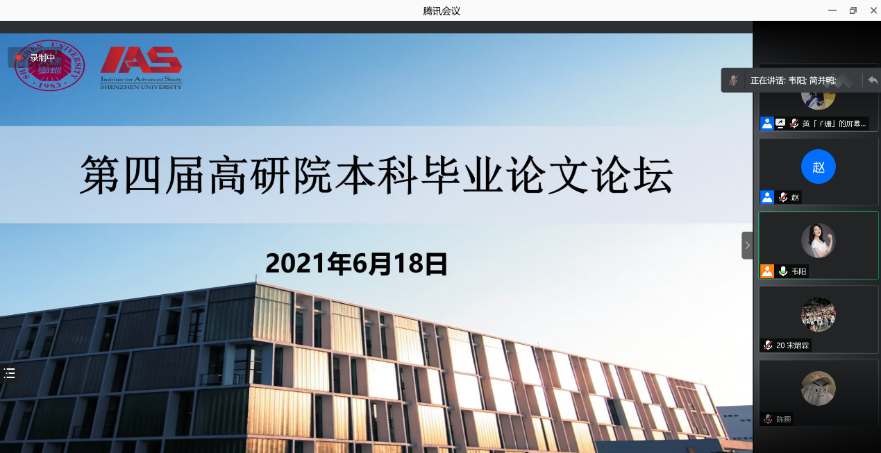 高等研究院第四届本科毕业论文论坛于2021年6月18日下午三点在腾讯会议平台召开,高等研究院副院长韦阳博士、英文课程顾问黄月圆教授、我院教师和各年级同学们参与云端会议聆听了6位优秀同学的精彩英文汇报。
