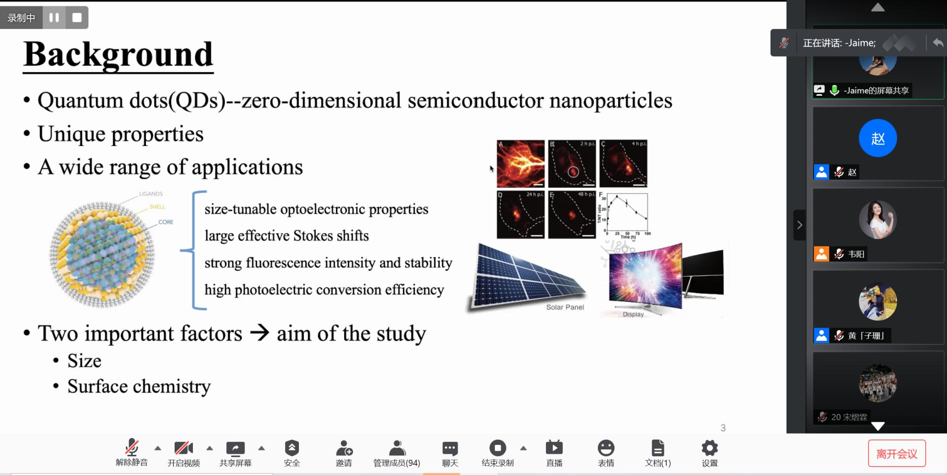 本次论坛由2019级理工创新实验班学生黄子珊主持,论坛语言为英语。论坛伊始,韦阳副院长代表院领导讲话,希望通过举办论坛展示我院2021届毕业生的英文水平、学习状态、综合素质与精神风貌,增强同学们对本专业和学术英语的学习兴趣,促进各专业同学之间的科研切磋与交流。同时特别感谢黄月圆教授及英语团队对学院英文教学及英语论文写作的支持与辛勤付出。
