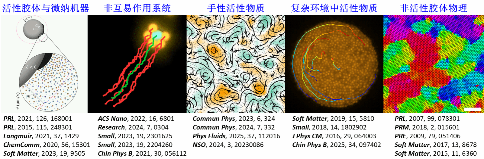 胶体合成与功能化、电磁场控制、结构光场、光镊操控、光学显微术、粒子定位与追踪、流变学与微流变学、软刻蚀术、微流体学、扩散泳理论、计算机模拟及有限元分析等